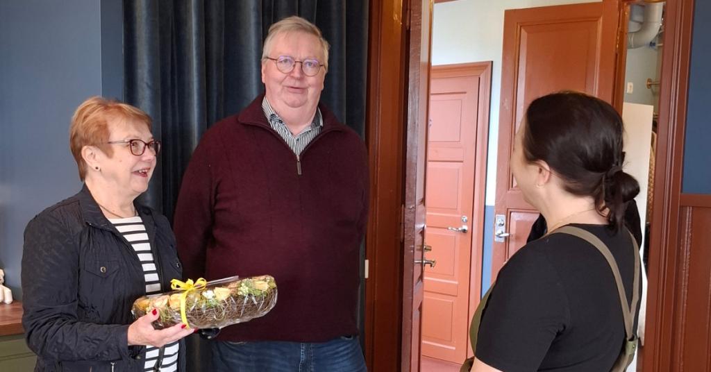 Lusin Kylätalo Oy:n hallituksen puheenjohtaja Virpi Malin ja hallituksen jäsen Hannu Viitanen onnittelemassa