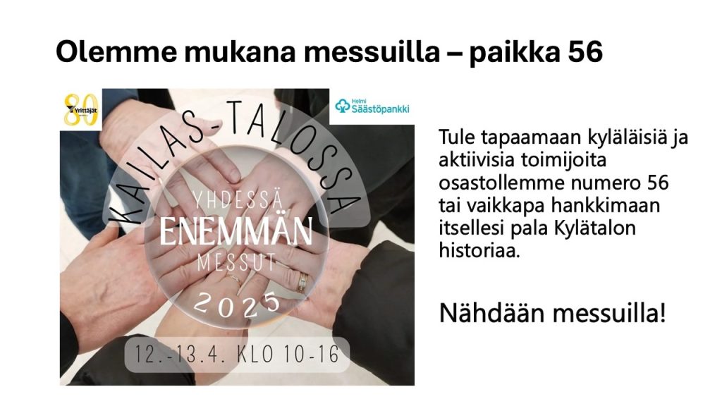 Lusin Kylätalo on myös mukana Yhdessä enemmän -messuilla Heinolassa 12.-13.4.2025 klo 10-16