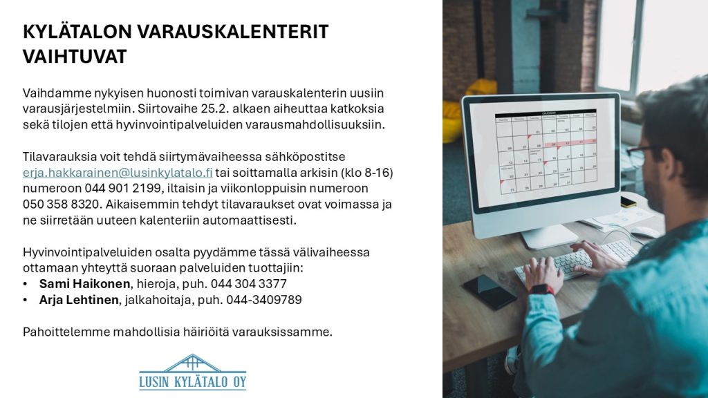 Tilavarauksia voit tehdä siirtymävaiheessa sähköpostitse erja.hakkarainen@lusinkylatalo.fi tai soittamalla arkisin (klo 8-16) numeroon 044 901 2199, iltaisin ja viikonloppuisin numeroon 050 358 8320. Aikaisemmin tehdyt tilavaraukset ovat voimassa ja ne siirretään uuteen kalenteriin automaattisesti.